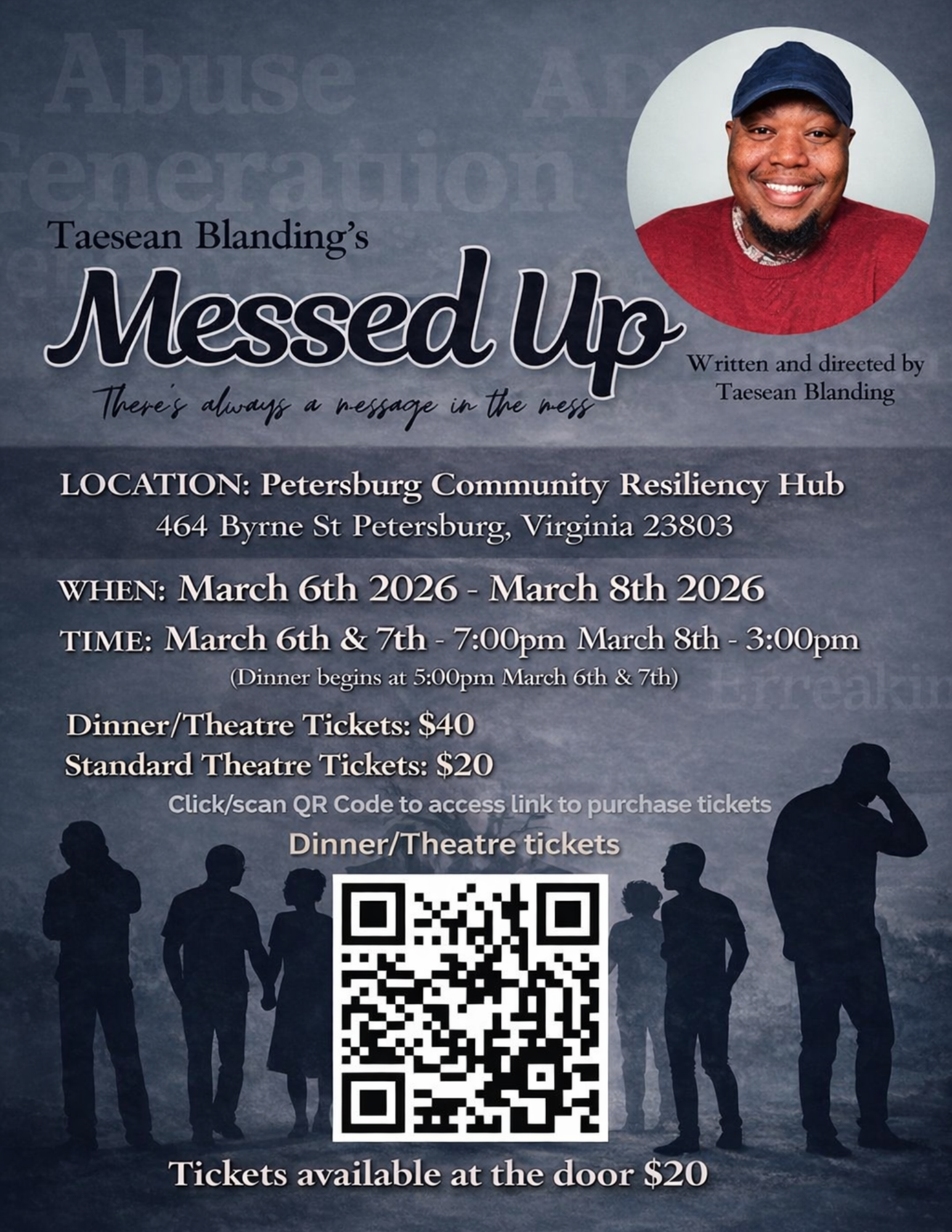 Join us at the Petersburg Community Resiliency Hub for a powerful stage production written and directed by Taesean Blanding. Messed Up confronts generational trauma, abuse, family dysfunction, and healing through an unforgettable theatrical experience featuring an incredible cast.